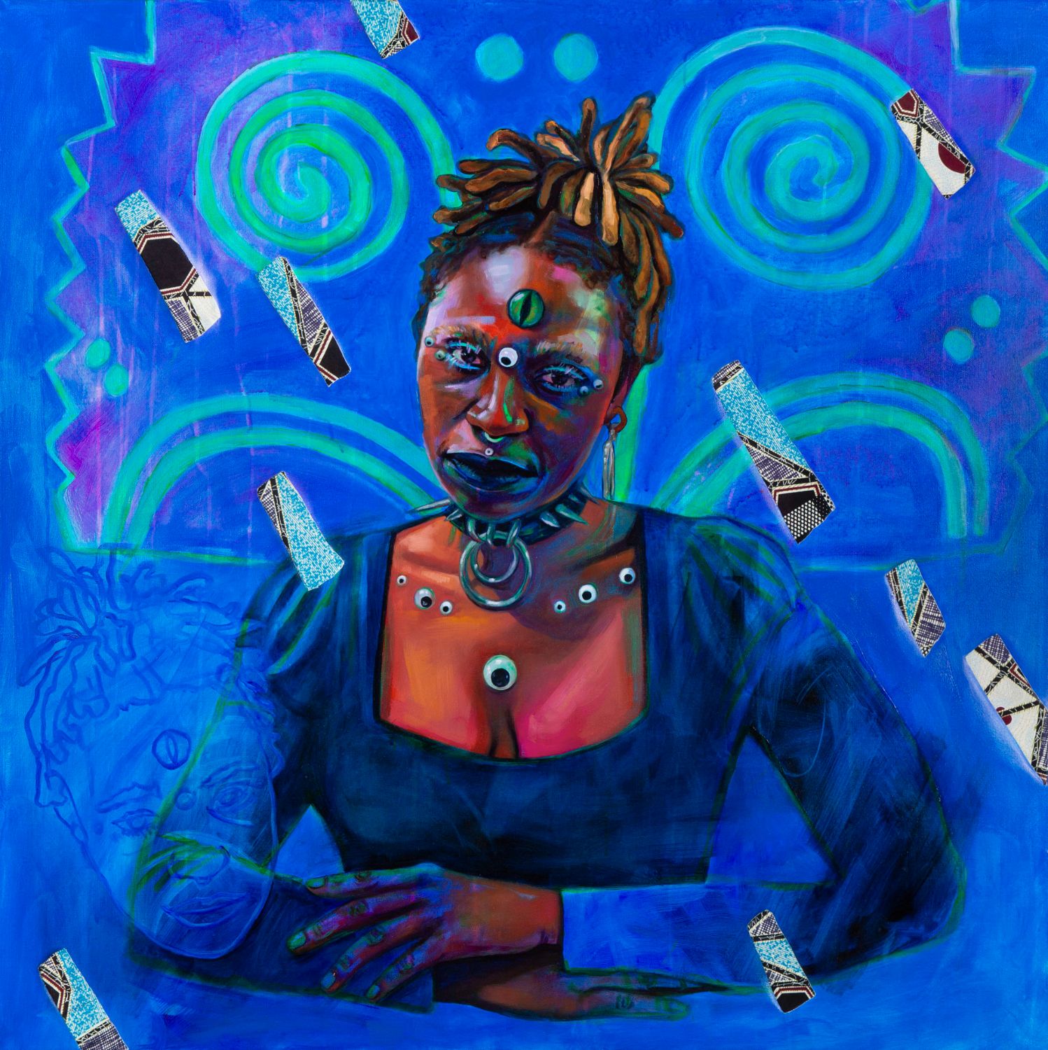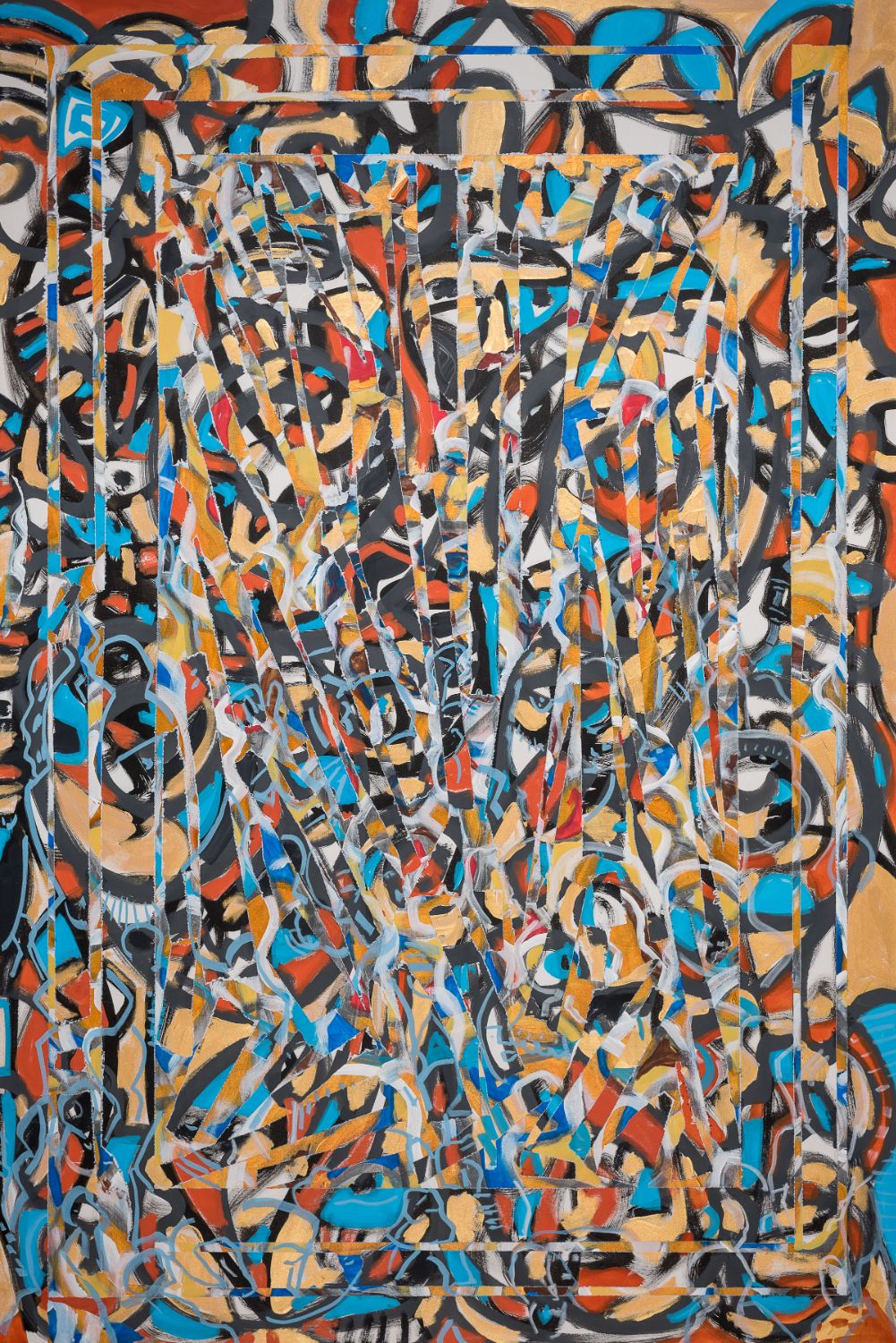 Across the gallery, Ta-coumba T. Aiken’s acrylic abstractions — Descendent of Giants, Somewhere is Knowhere, and Incognegrito — are unsettling in their own right. Dense layers of tangled orange, blue, and yellow wind through each canvas in movements that refuse resolution, a turbulence that feels both external and internal.