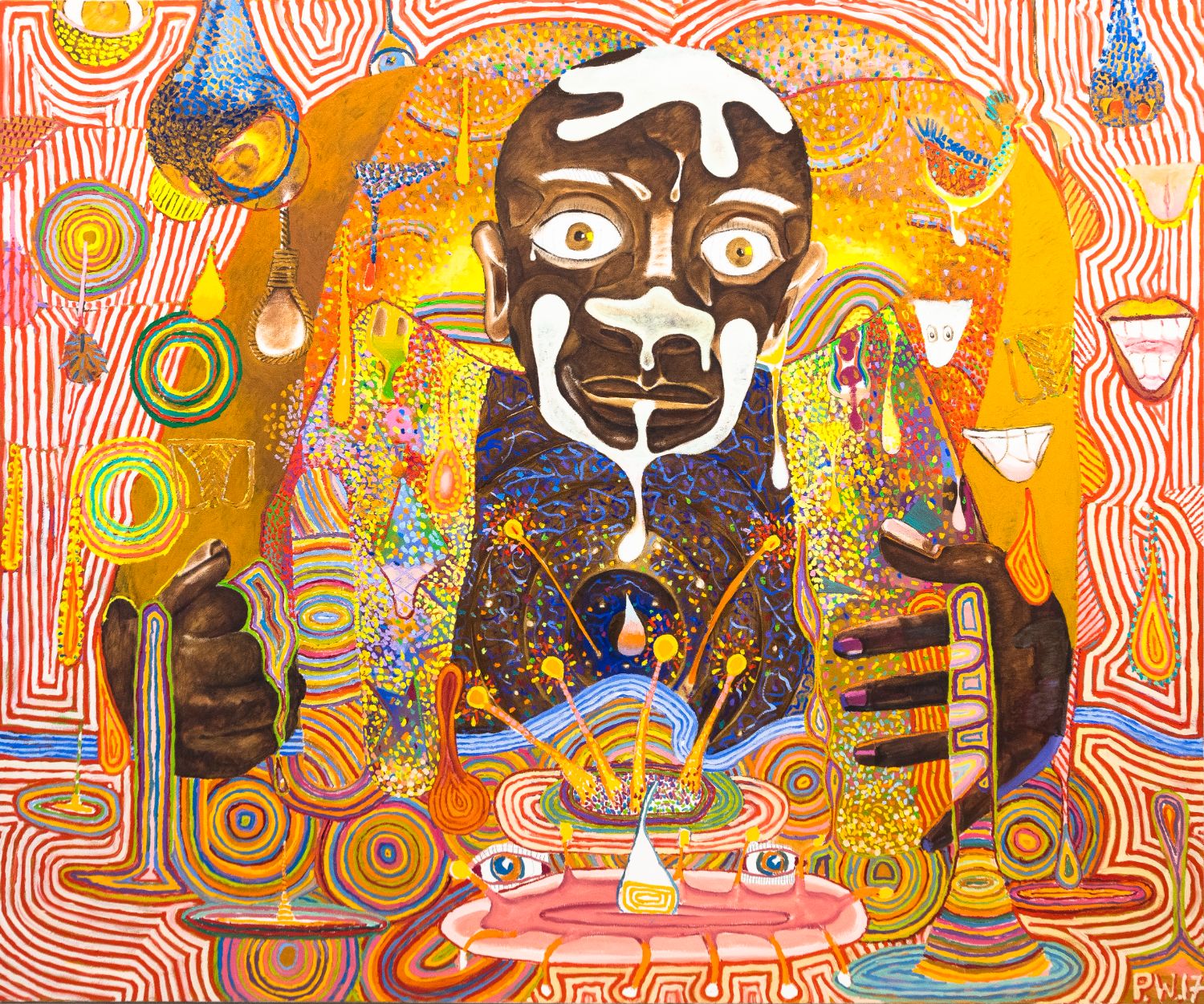 In an untitled self-portrait, painter and activist Peter Williams stares wide-eyed and unblinking, his face streaked with white liquid. From his chest, a glimmering vortex resembles a universe breaking open like a cosmic wound. Teeth, lightbulbs, fields of red and orange swirl around him, his hands reach outward.